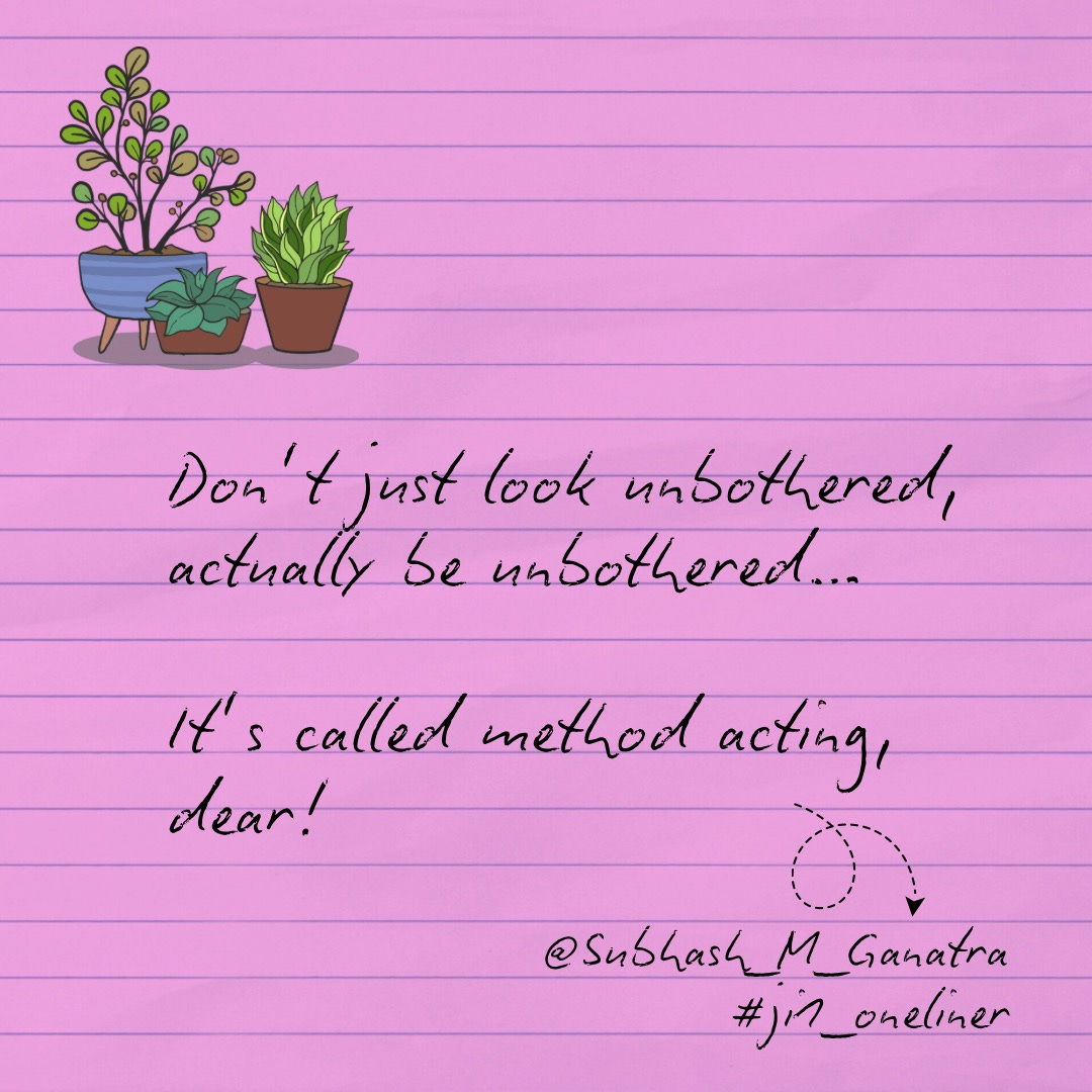 Believe in method acting…Subhash_M_GanatraMay 25, 20251ShareDon’t just look unbothered, actually be unbothered…It’s called method acting, dear!#ji1_oneliner